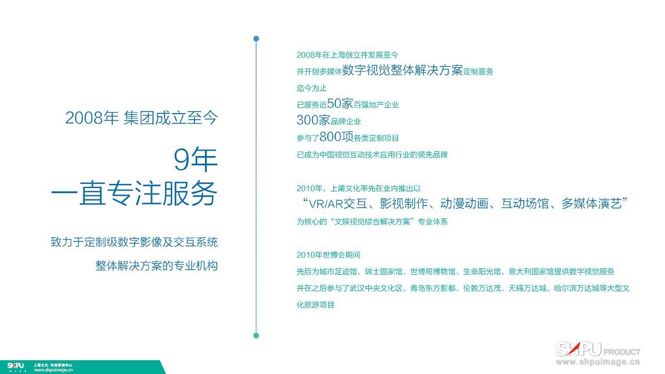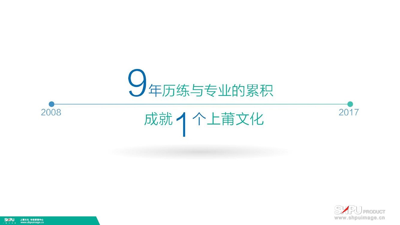 九年来“上莆文化”始终遵循“为客户所想”的服务理念,通过科学的人力资源管理机制和学习型组织的建立,培养了一支具有丰富专业经验的管理和技术团队。通过持续的管理提升,将“上莆文化”的企业文化融合到企业运营中。历经九年发展,健全了创意、设计、制作、合成等完整服务机制,造就了一流的文化品牌。